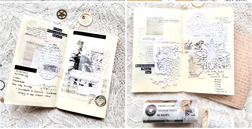 I love diecuts. You are going to see my creations of diecuts and how I use them in journals. My favourite colours are off white, black, kraft and neutrals.